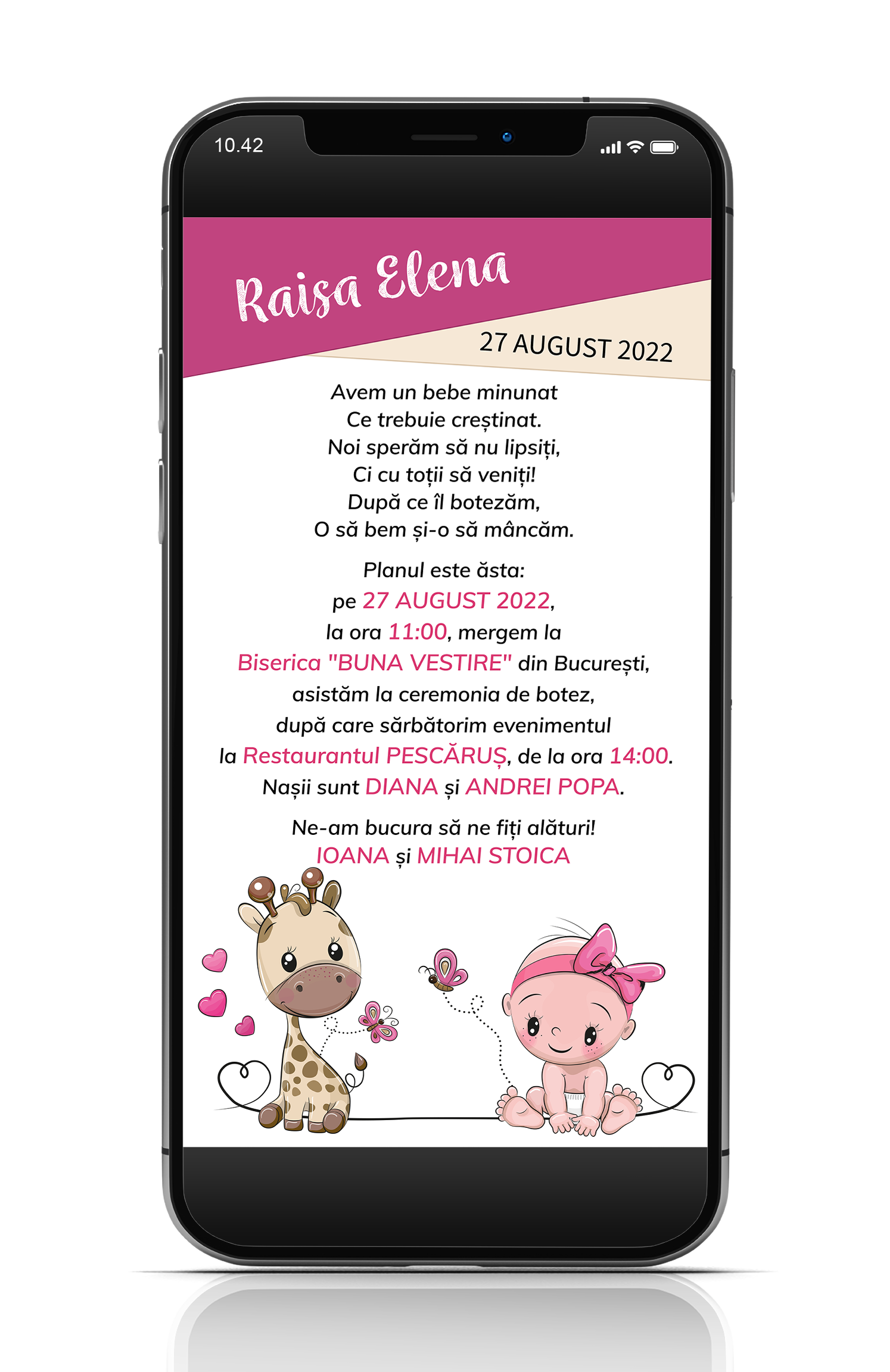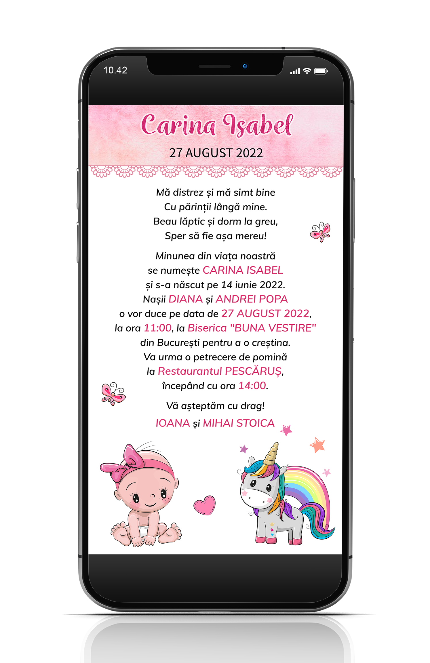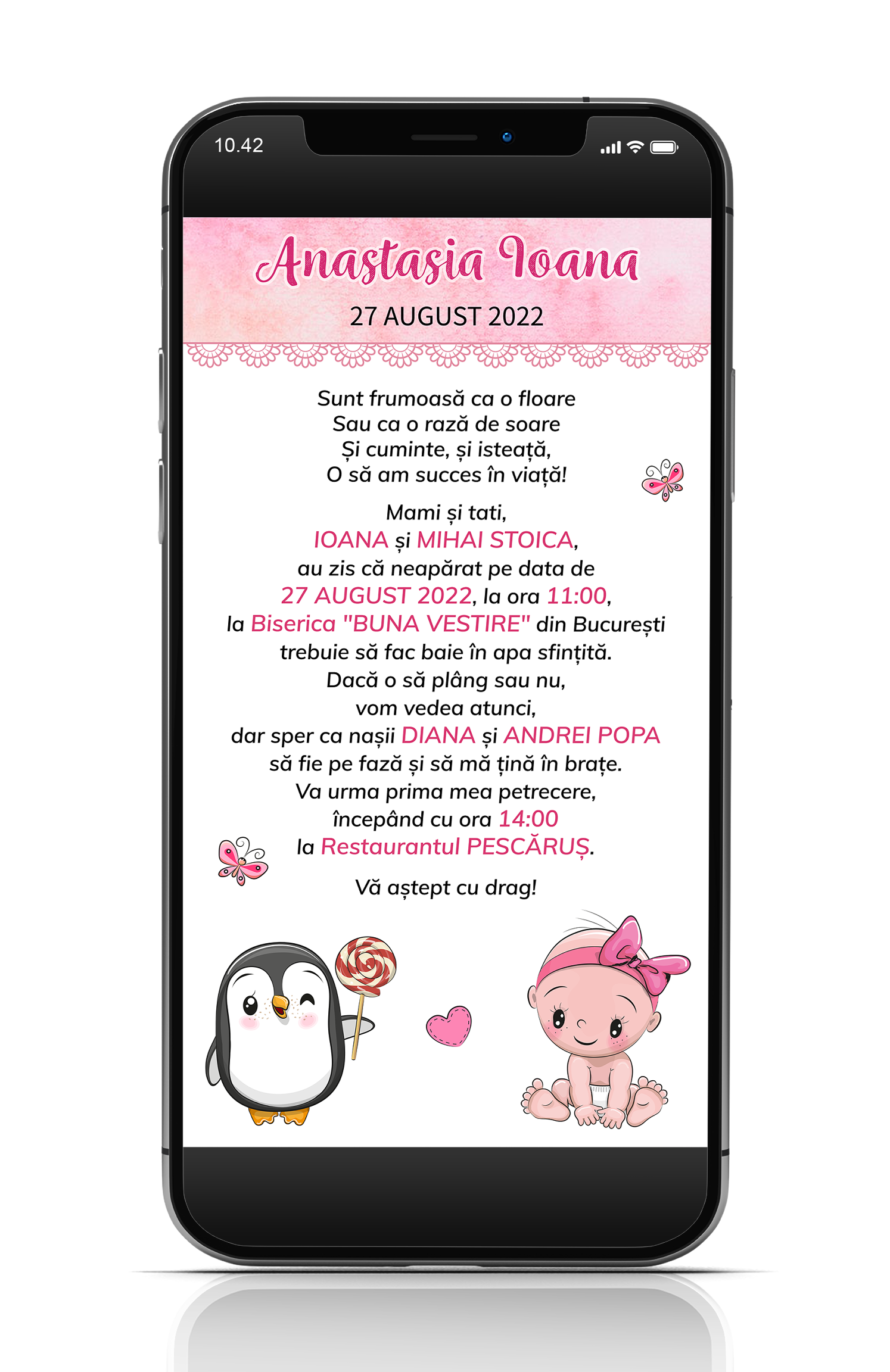 Puteti comanda aici o invitatie pentru botez in format digital pe care o puteti trimite online pe email, telefon sau social media - facebook, instagram, tiktok, etc.