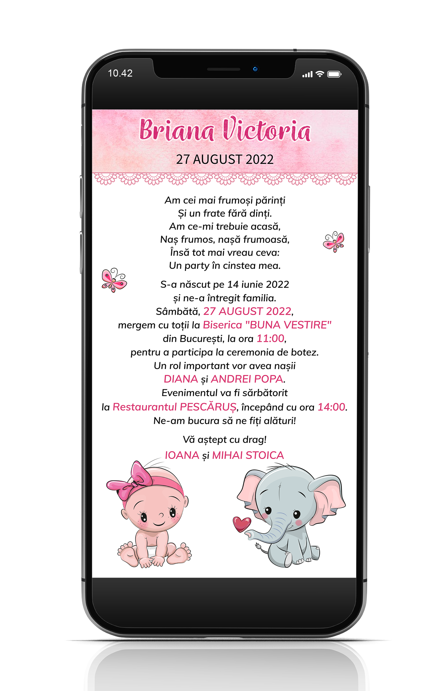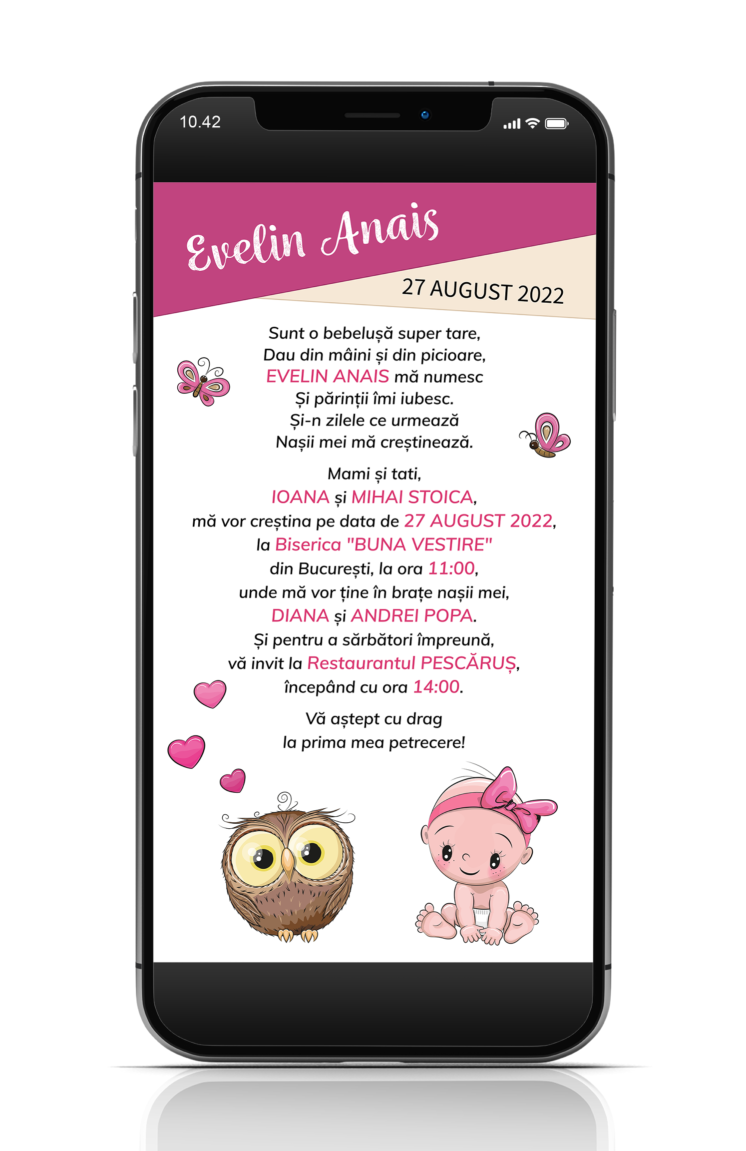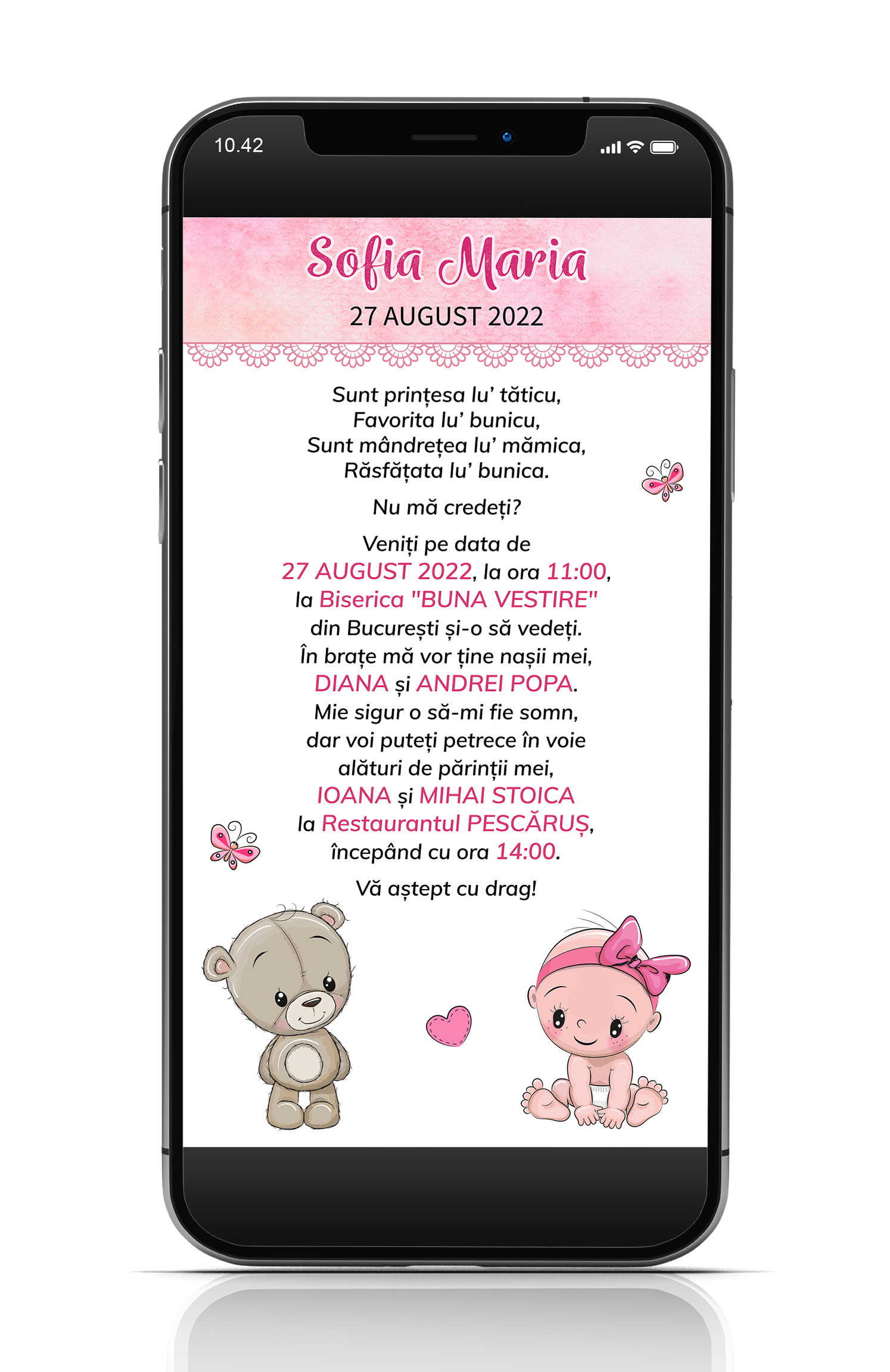 Puteti comanda aici o invitatie pentru botez in format digital pe care o puteti trimite online pe email, telefon sau social media - facebook, instagram, tiktok, etc.