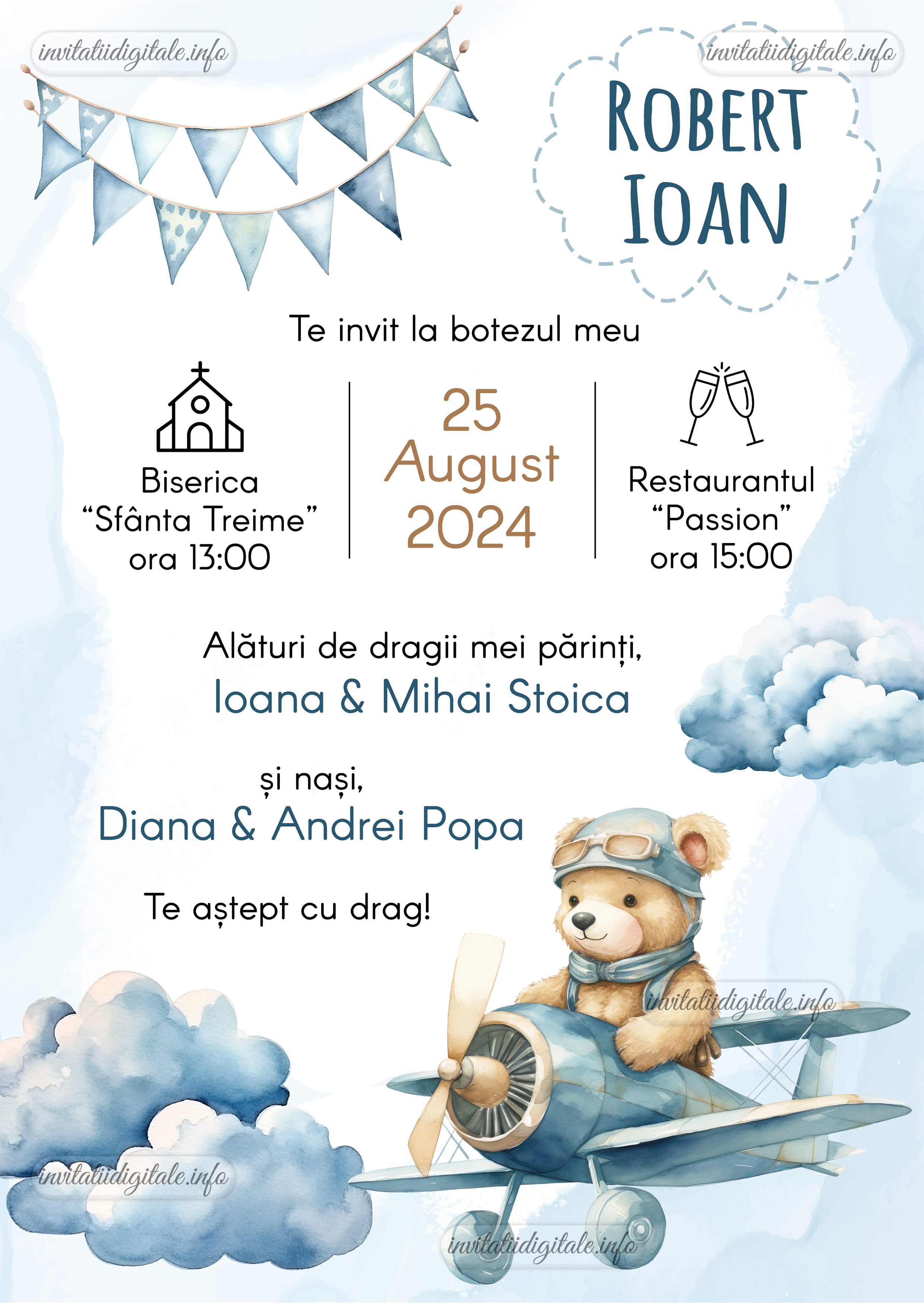 Invitatie digitala botez baieti – Ursulet in avion – IB-96