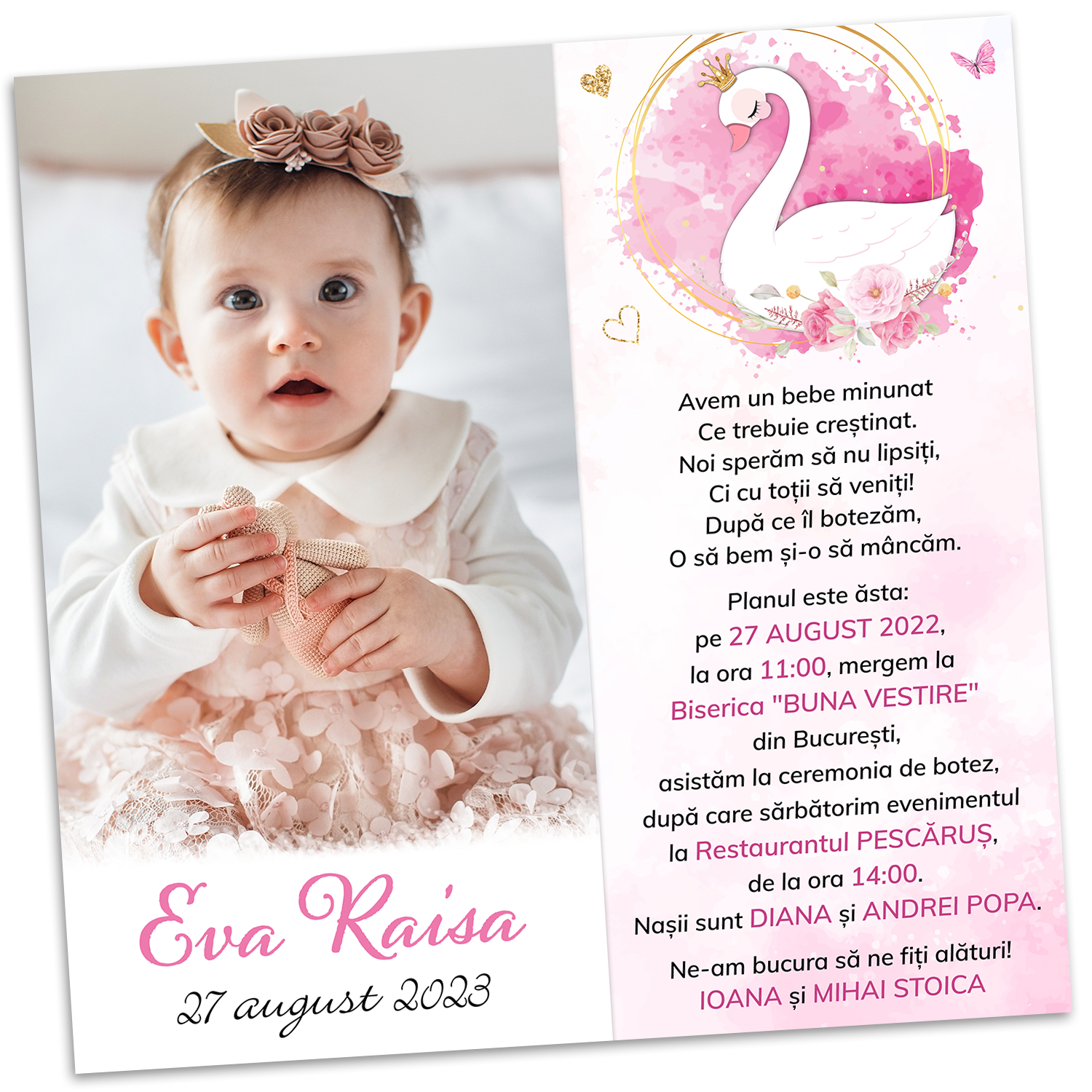 Invitatie de botez in format digital cu poza fetitei, tema Lebada, pentru telefon mobil, email, Facebook si Instagram.