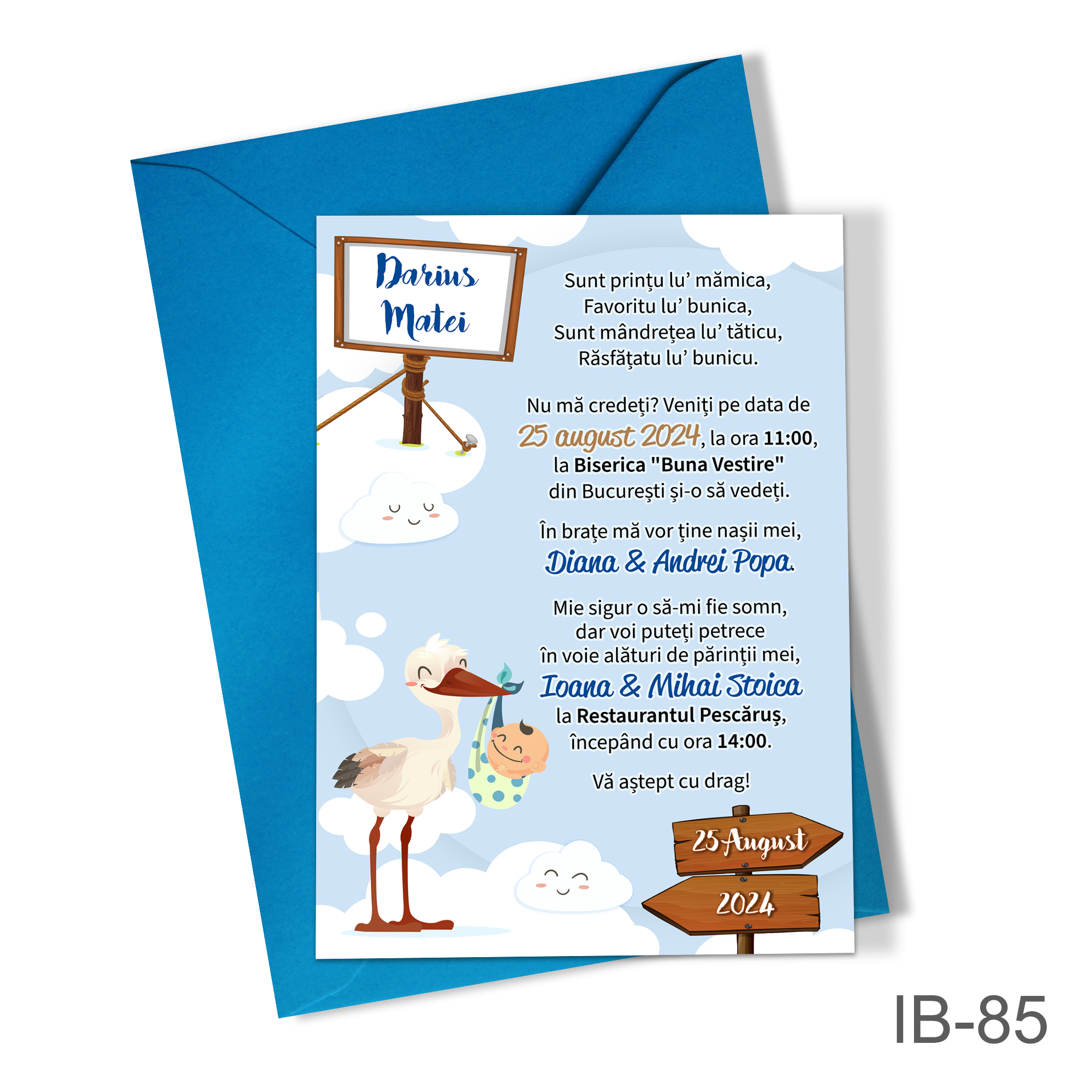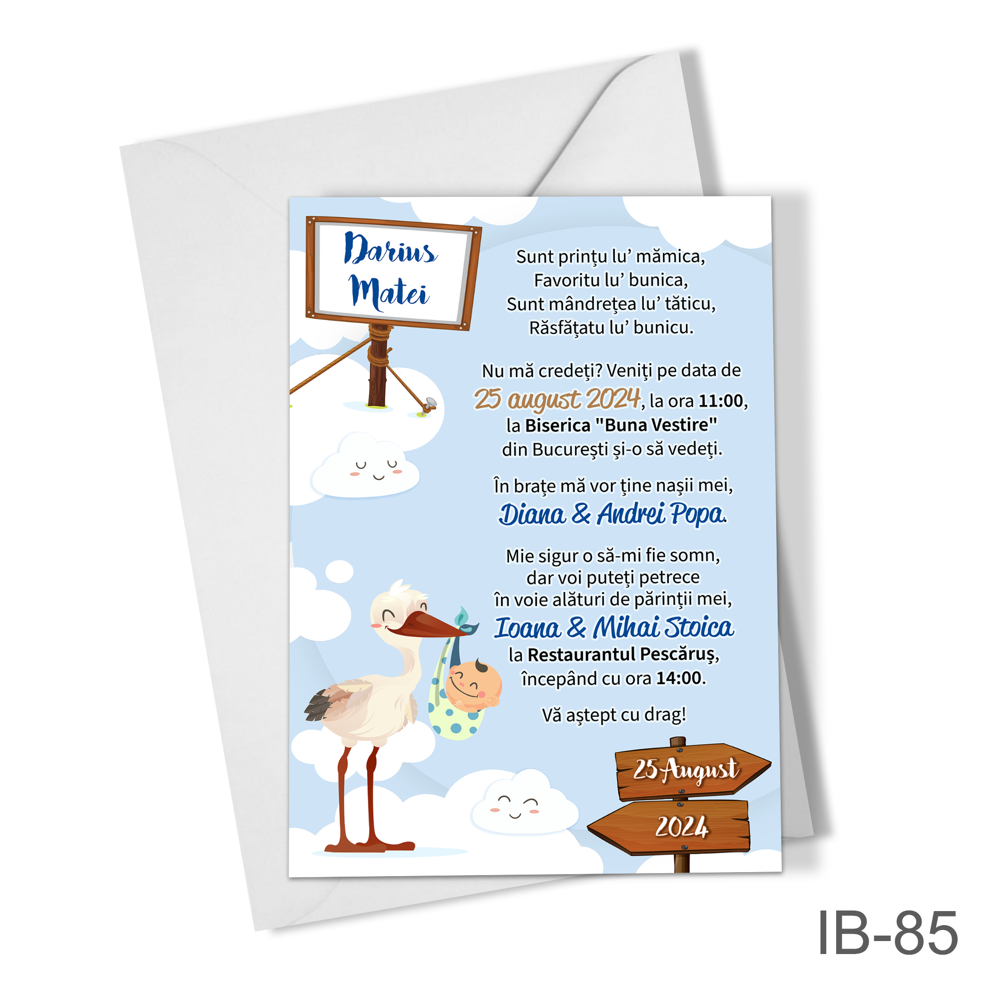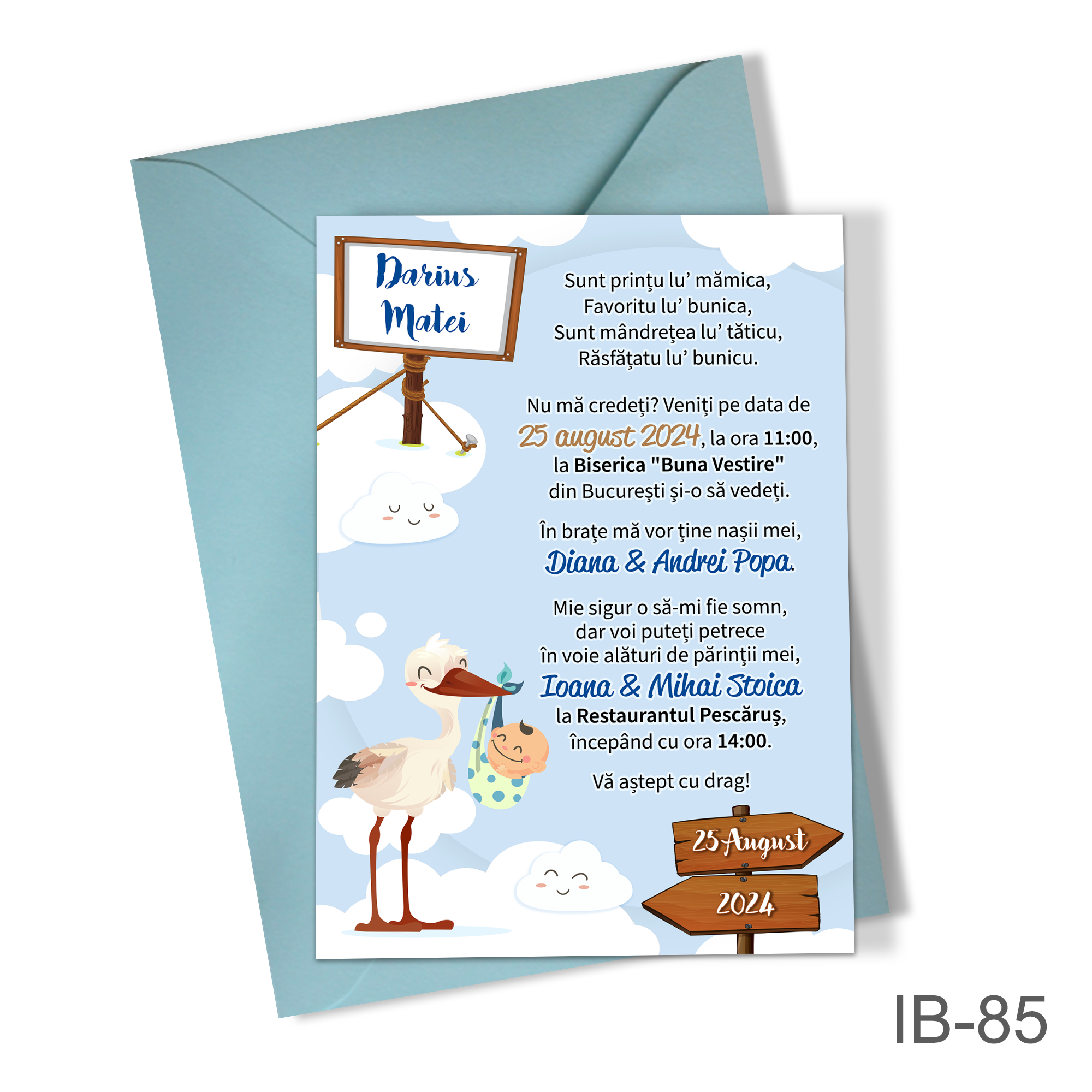 Invitatii botez baieti cu plic colorat – Barza – IB-85