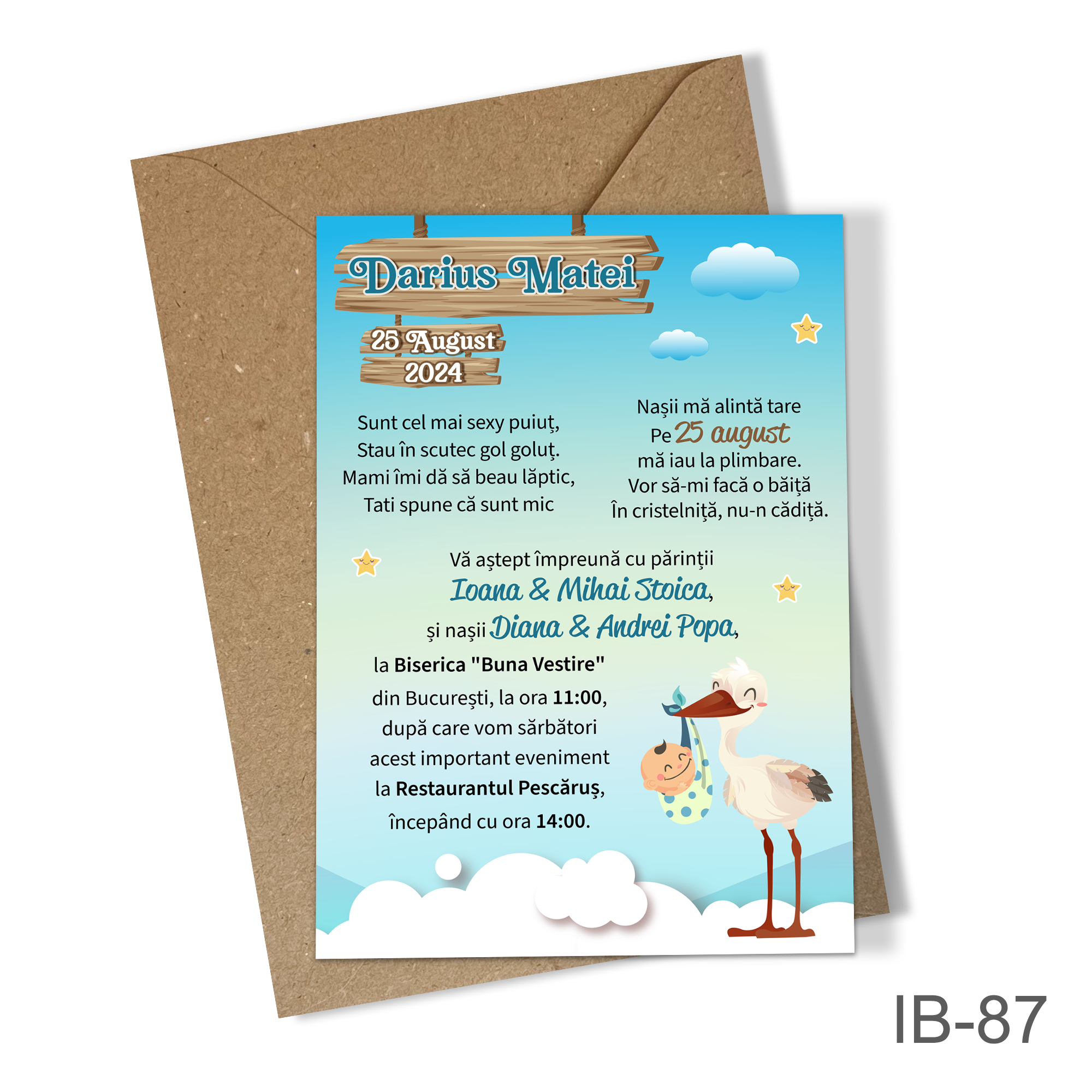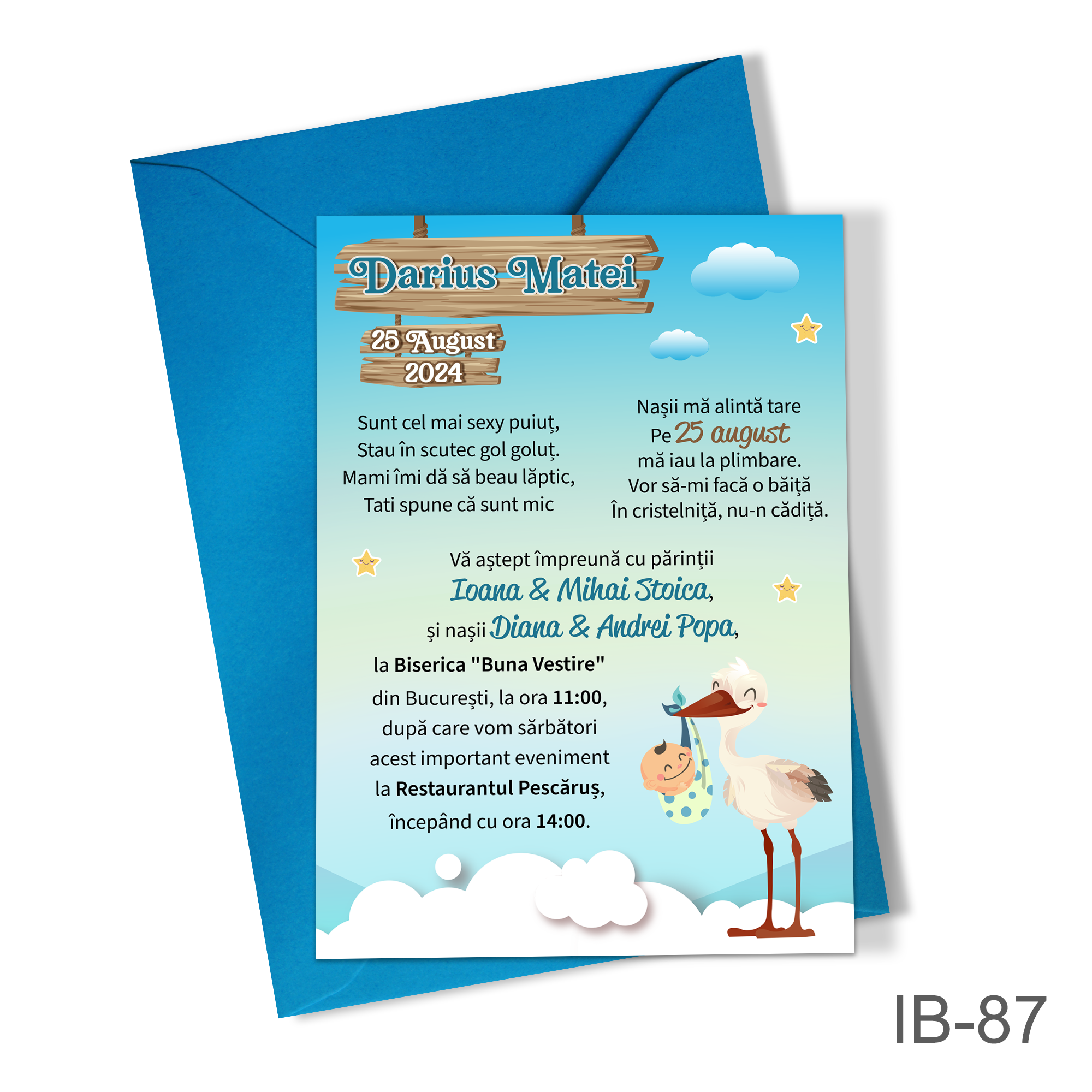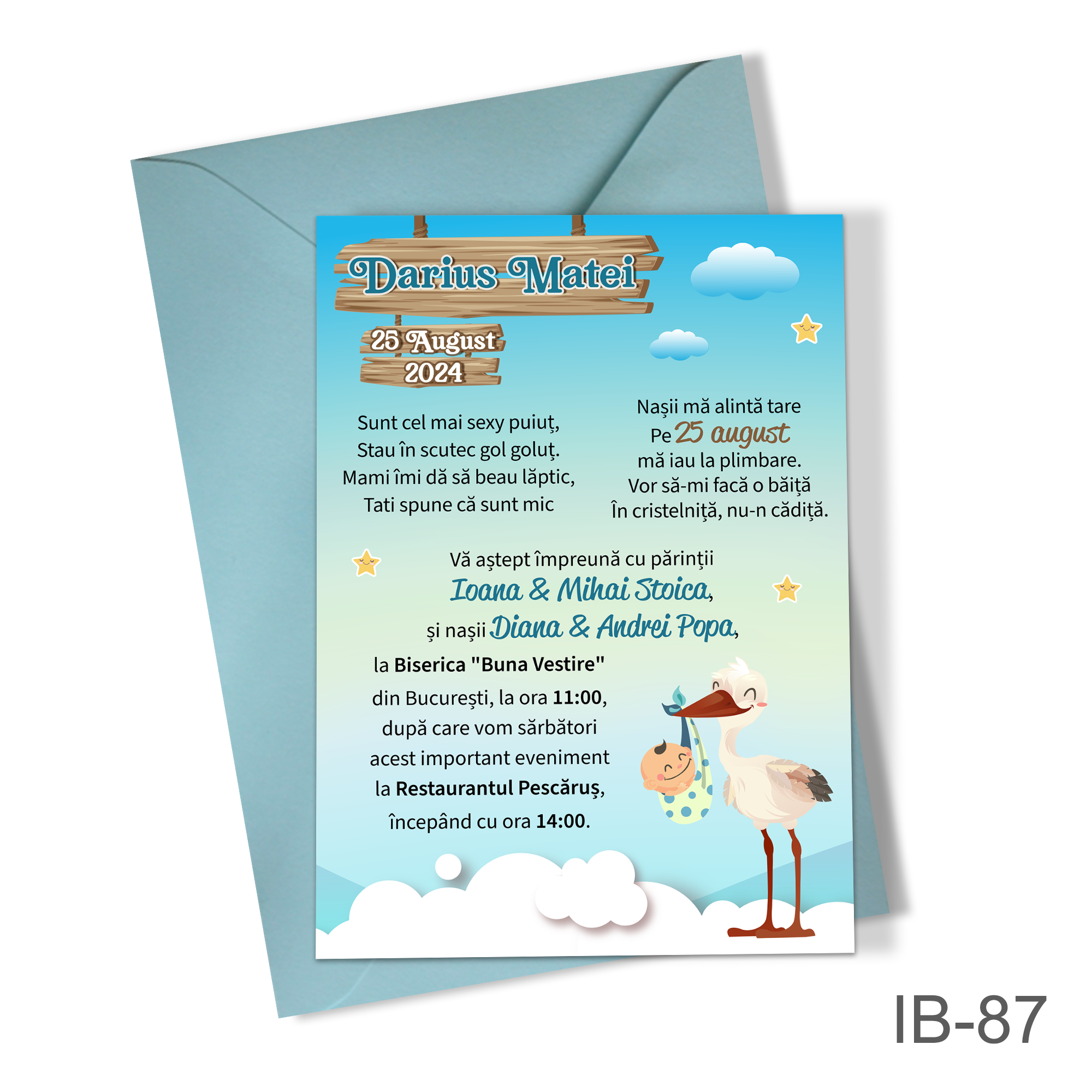 Invitatii botez baieti cu plic colorat – Barza – IB-87