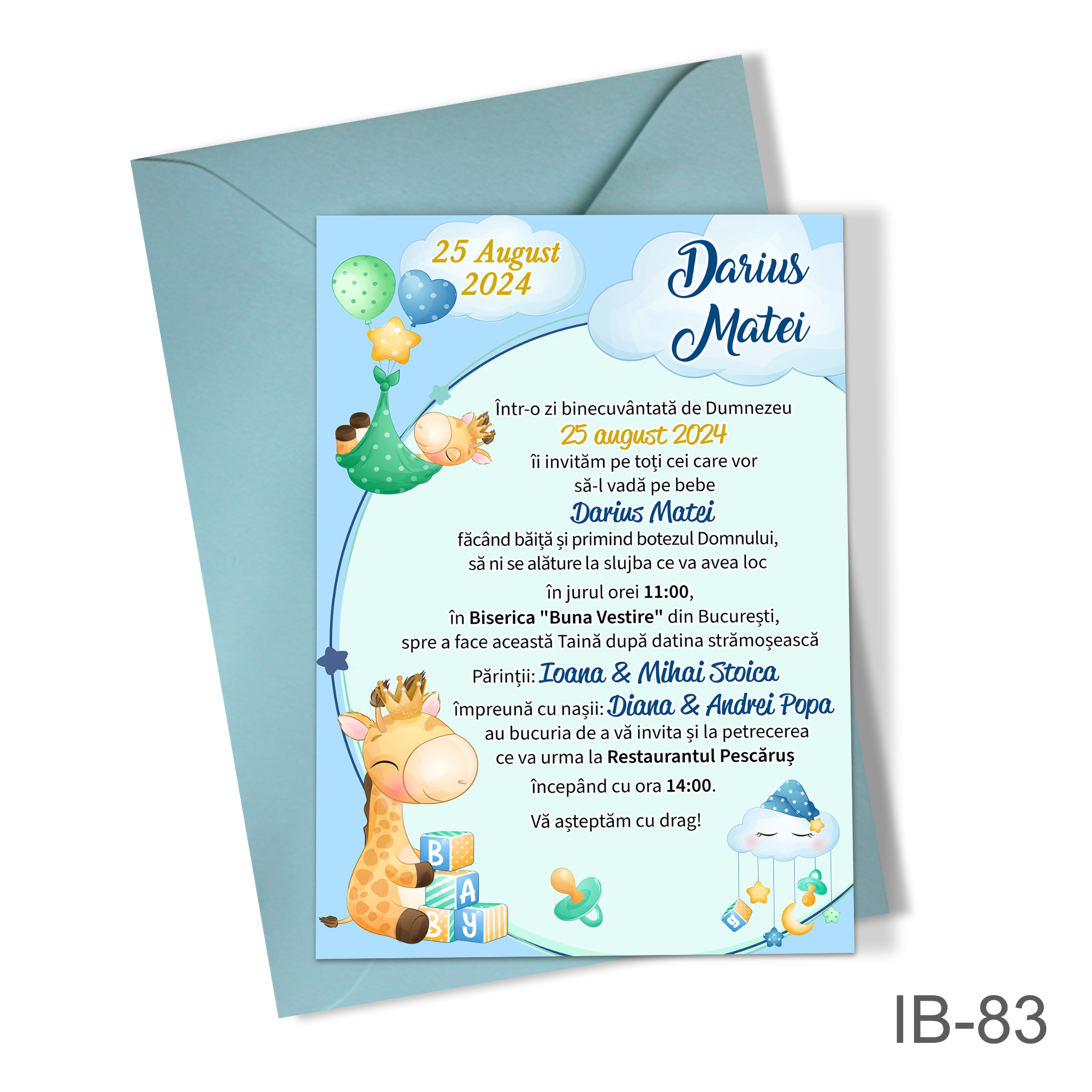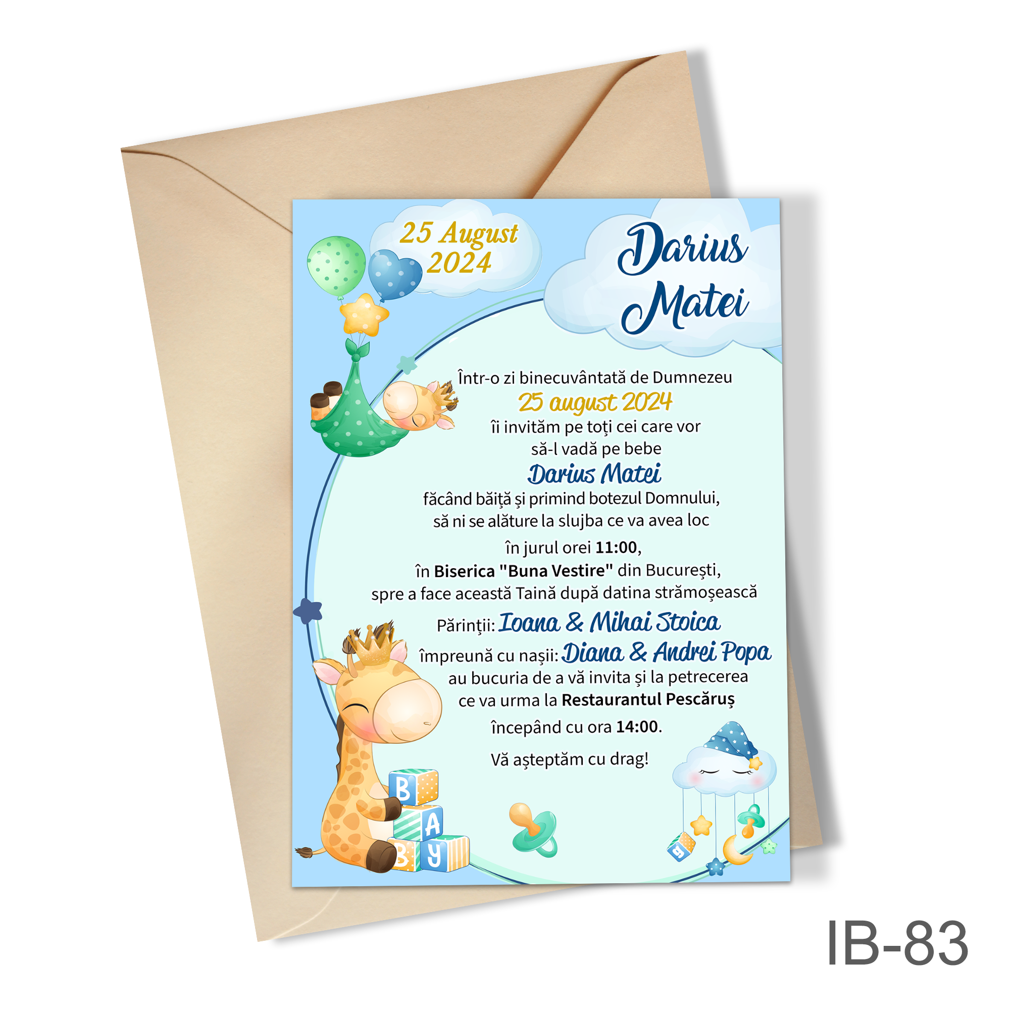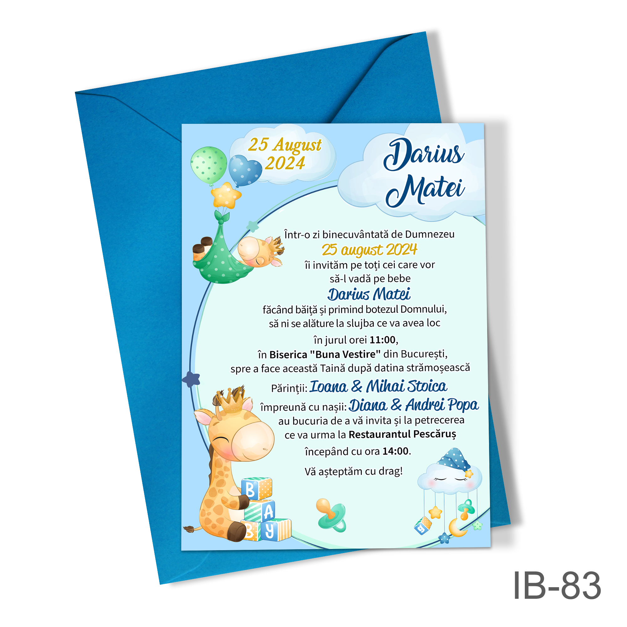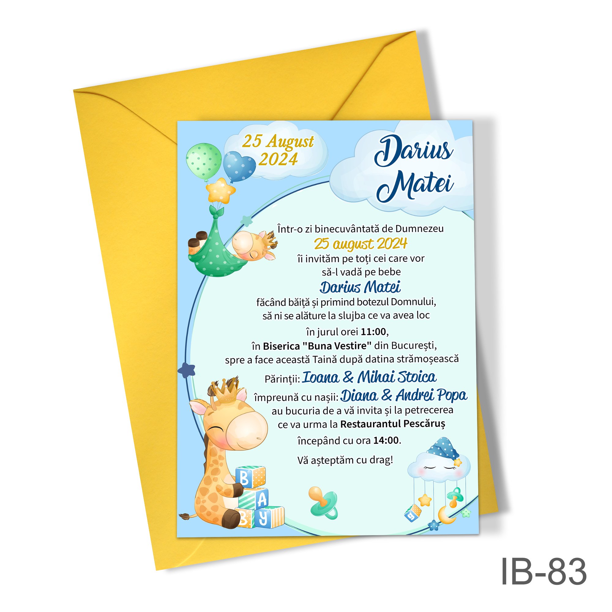 Invitatii botez baieti cu plic colorat – Girafa – IB-83