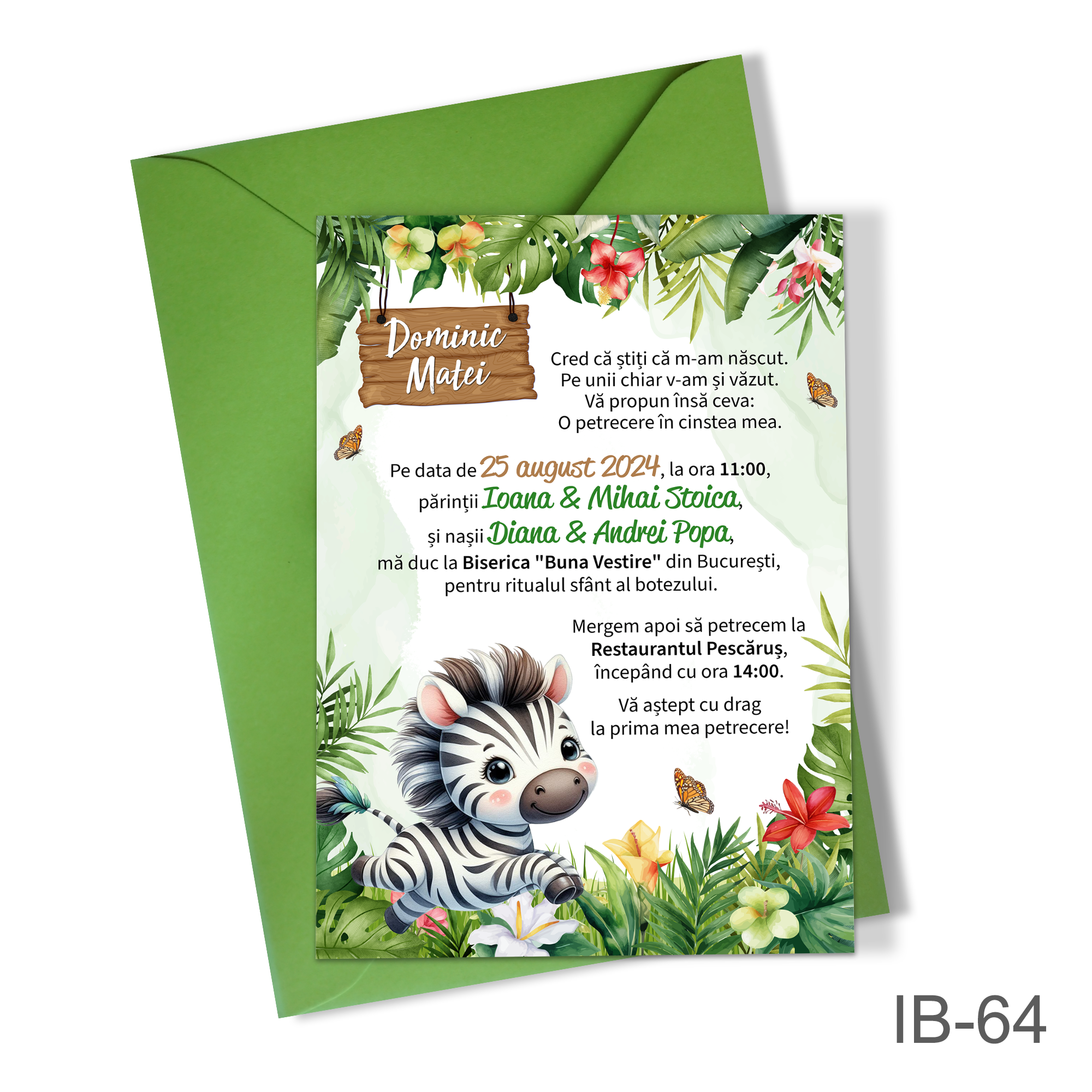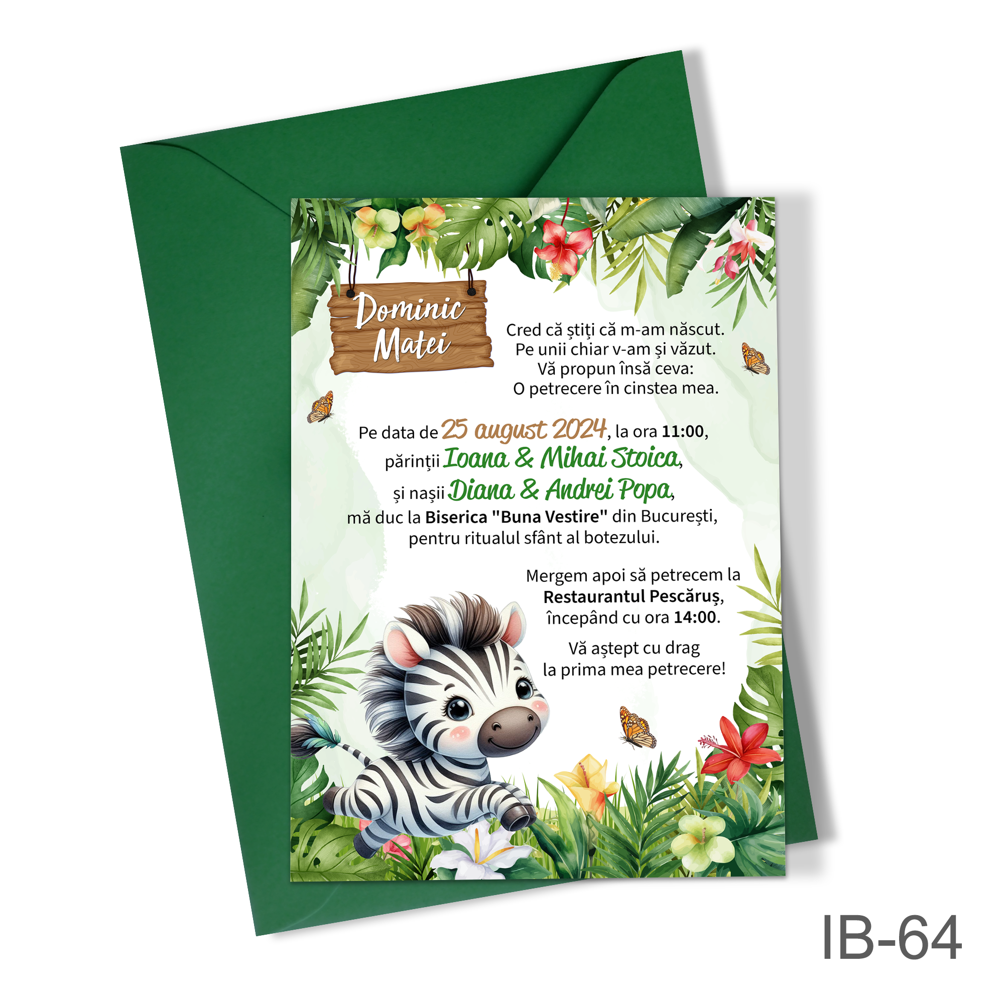 Invitatii botez baieti cu plic colorat – Safari Zebra – IB-64