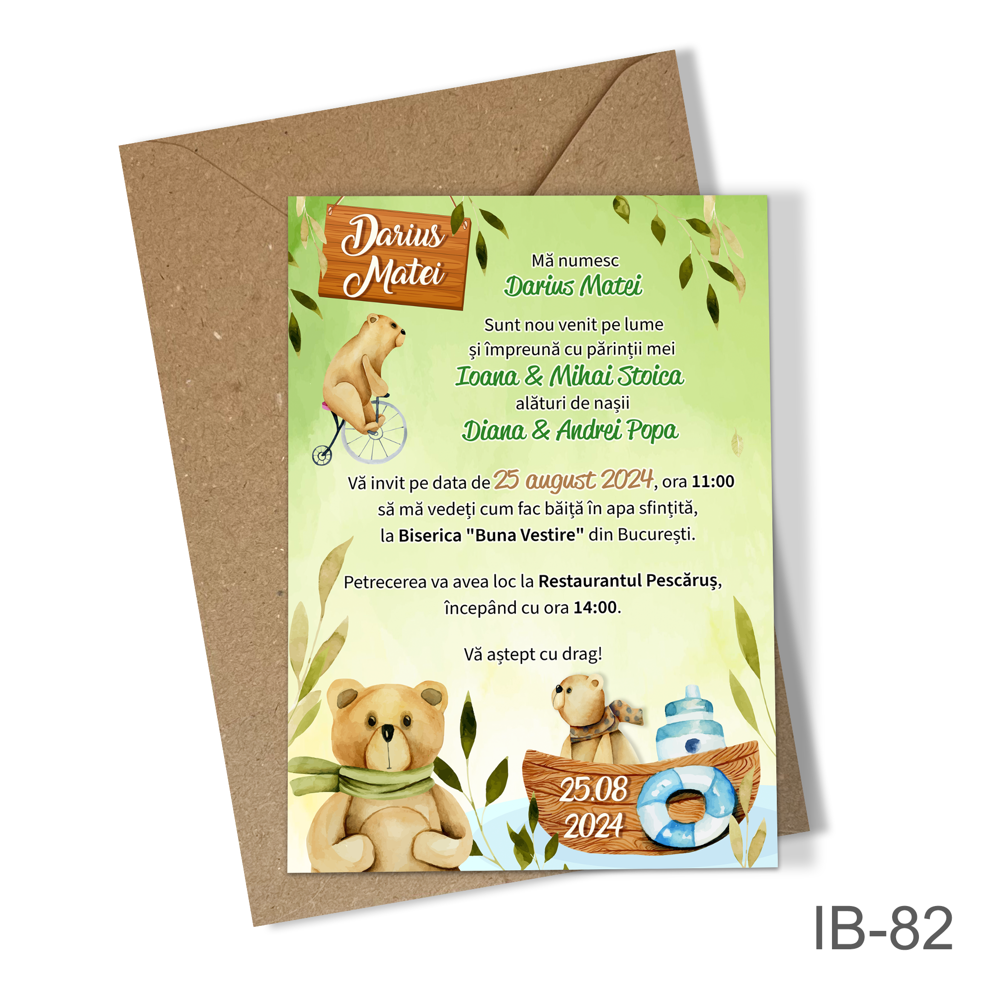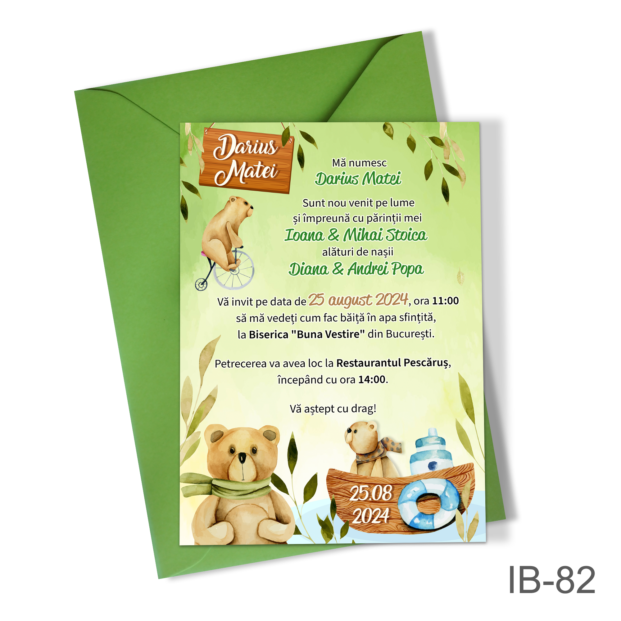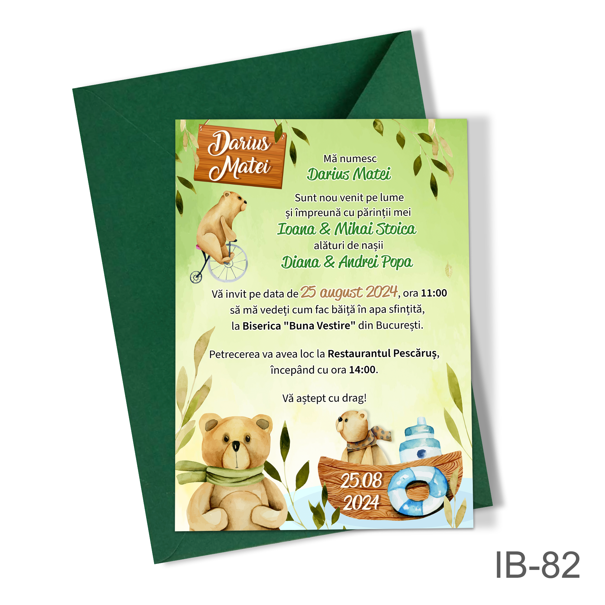 Invitatii botez baieti cu plic colorat – Ursulet – IB-82