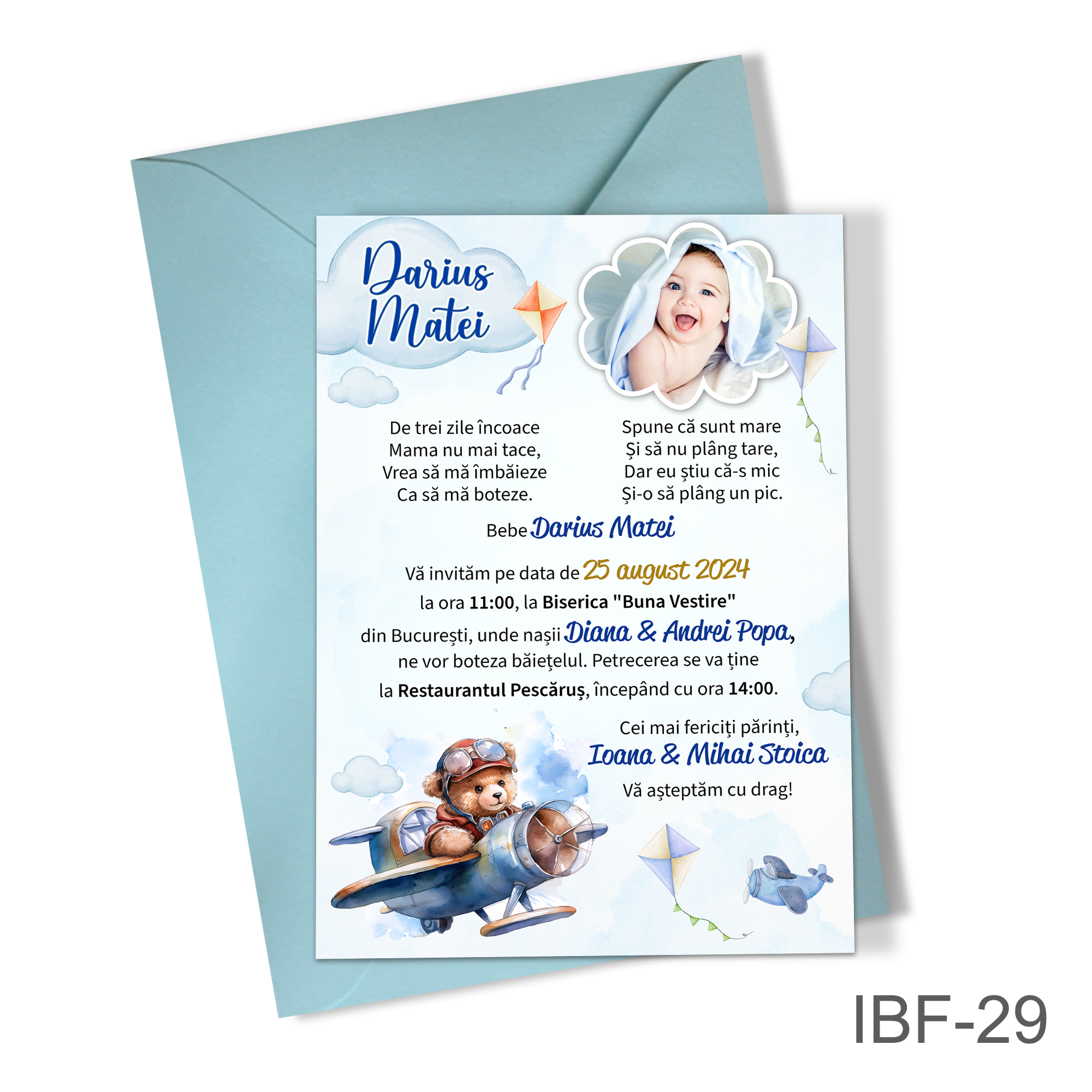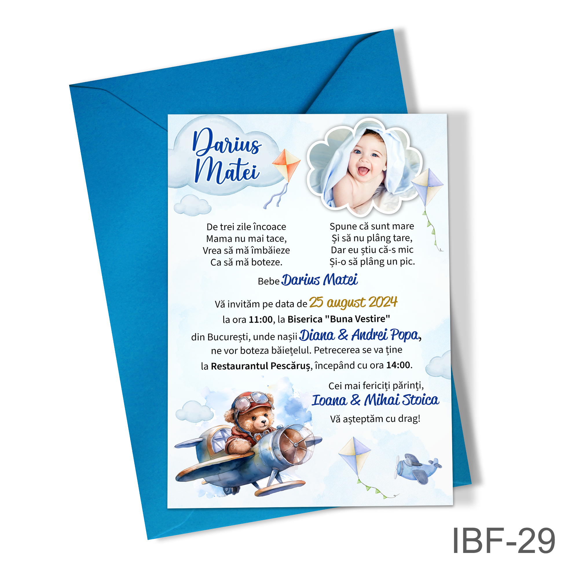 Invitatii botez baieti cu poza si plic colorat – Ursulet in avion – IBF-29