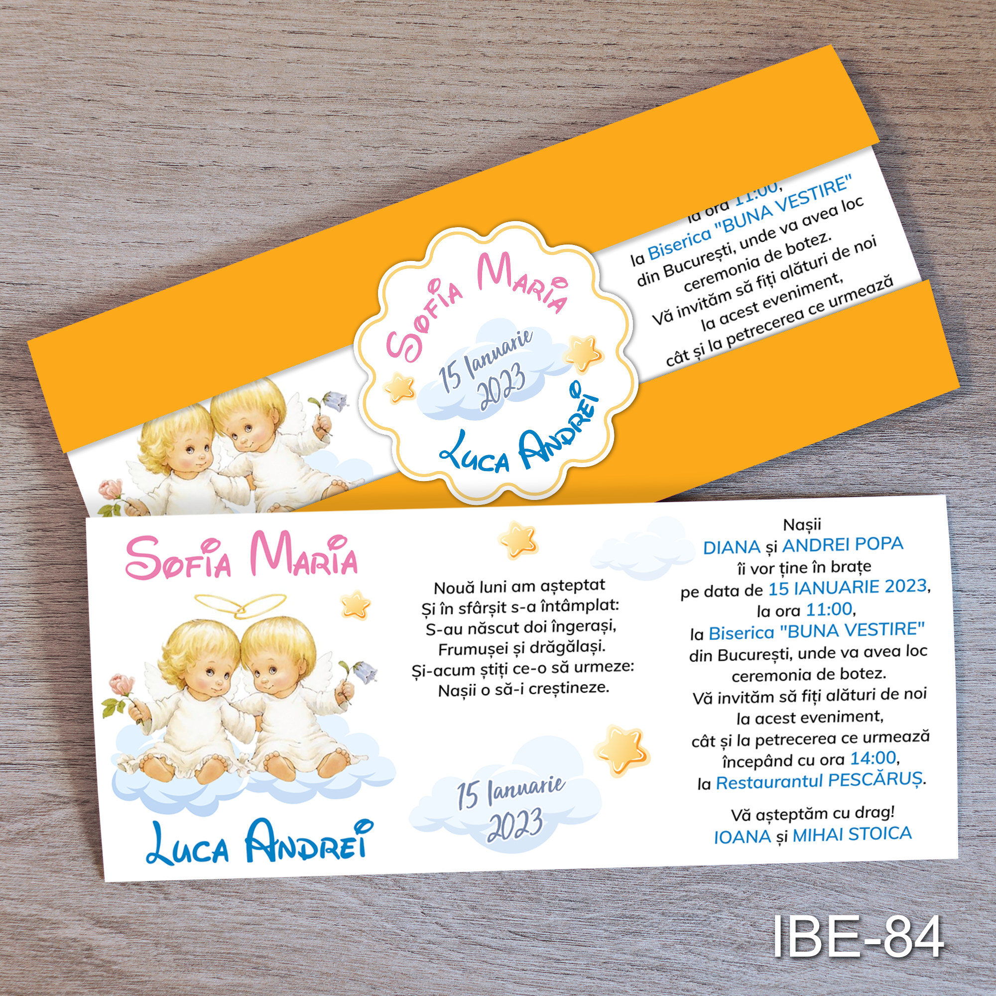 Invitatii botez gemeni – Ingerasi – Cu Eticheta si Plic Galben – IBE-84
