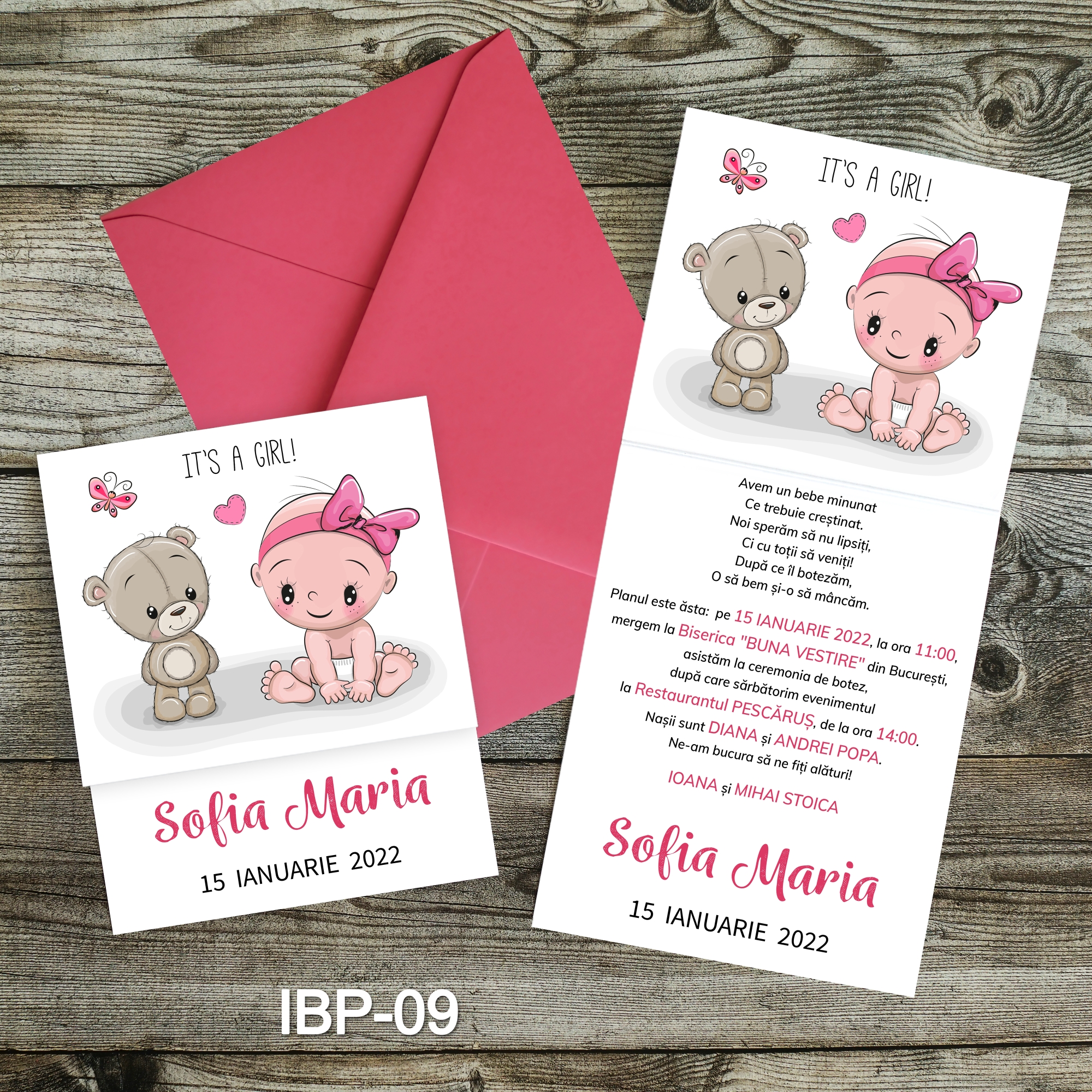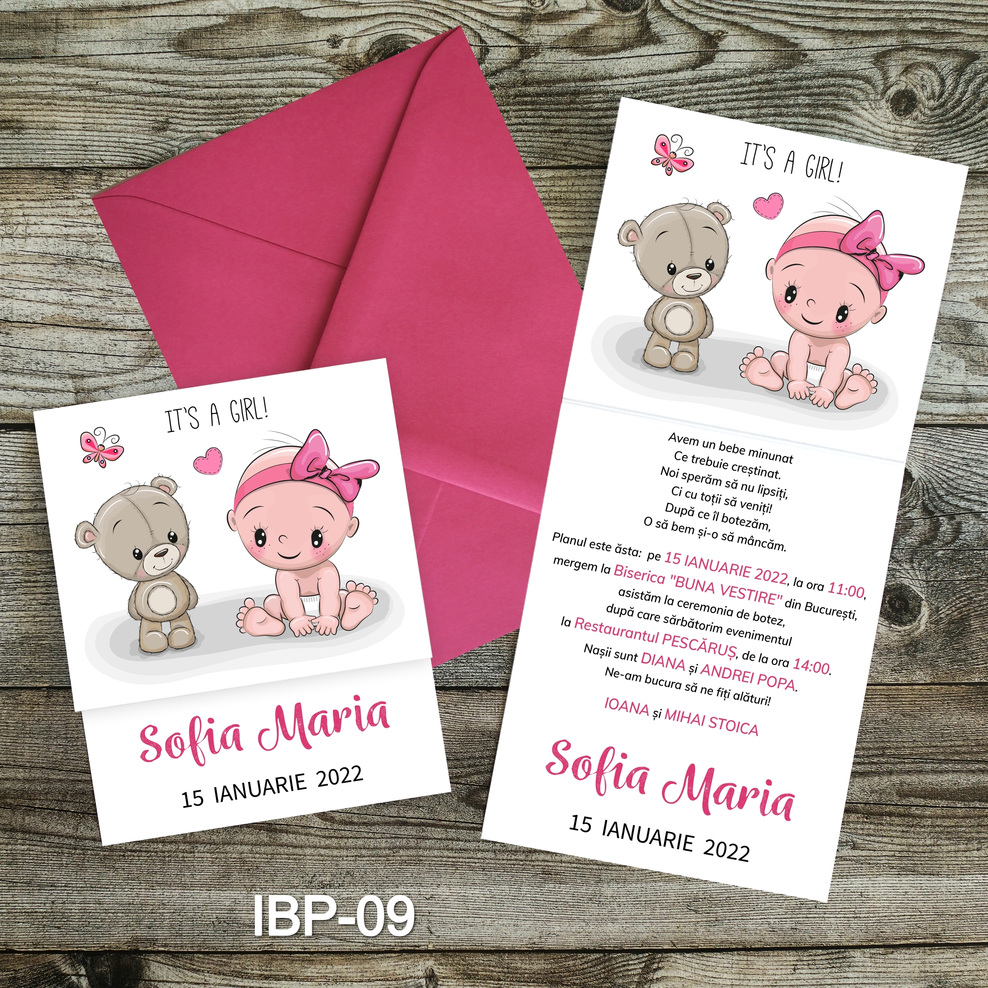 Invitatiile sunt tiparite fata-verso, pliate si ambalate in plic colorat asortat.